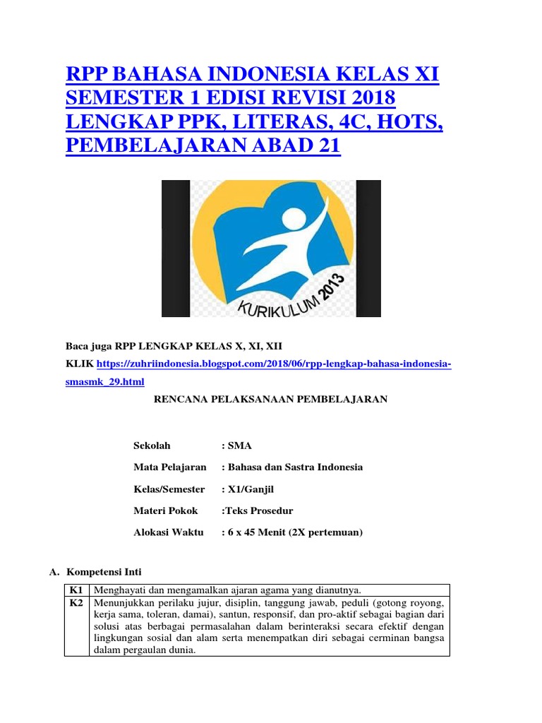 Rpp Bahasa Indonesia Kelas Xi Semester 1 Edisi Revisi 2018